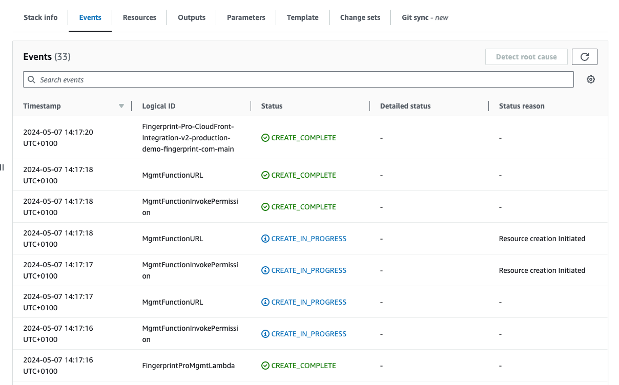1. Go to CloudFormation > Stacks and open your newly created stack (named Fingerprint-Pro-Cloudfront-Integration-v2 by default).