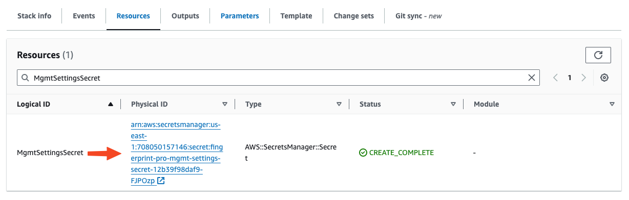 3. Switch to the Resources tab. Click the Physical ID of the MgmtSettingsSecret.