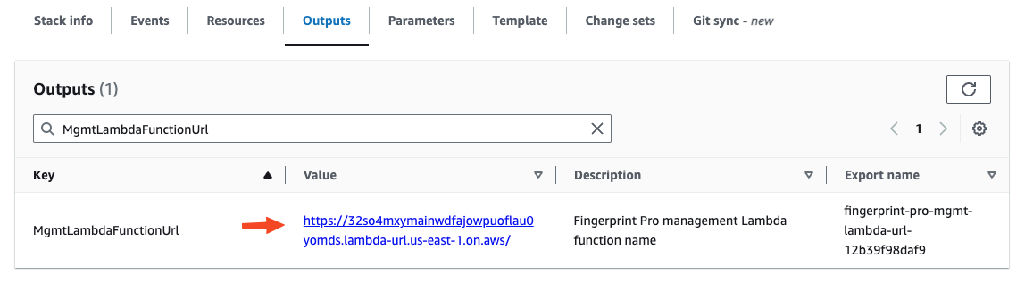 • The Export name of FingerprintProMgmtLambda is a unique name of the created Management function responsible for delivering updates to the main Lambda proxy function.