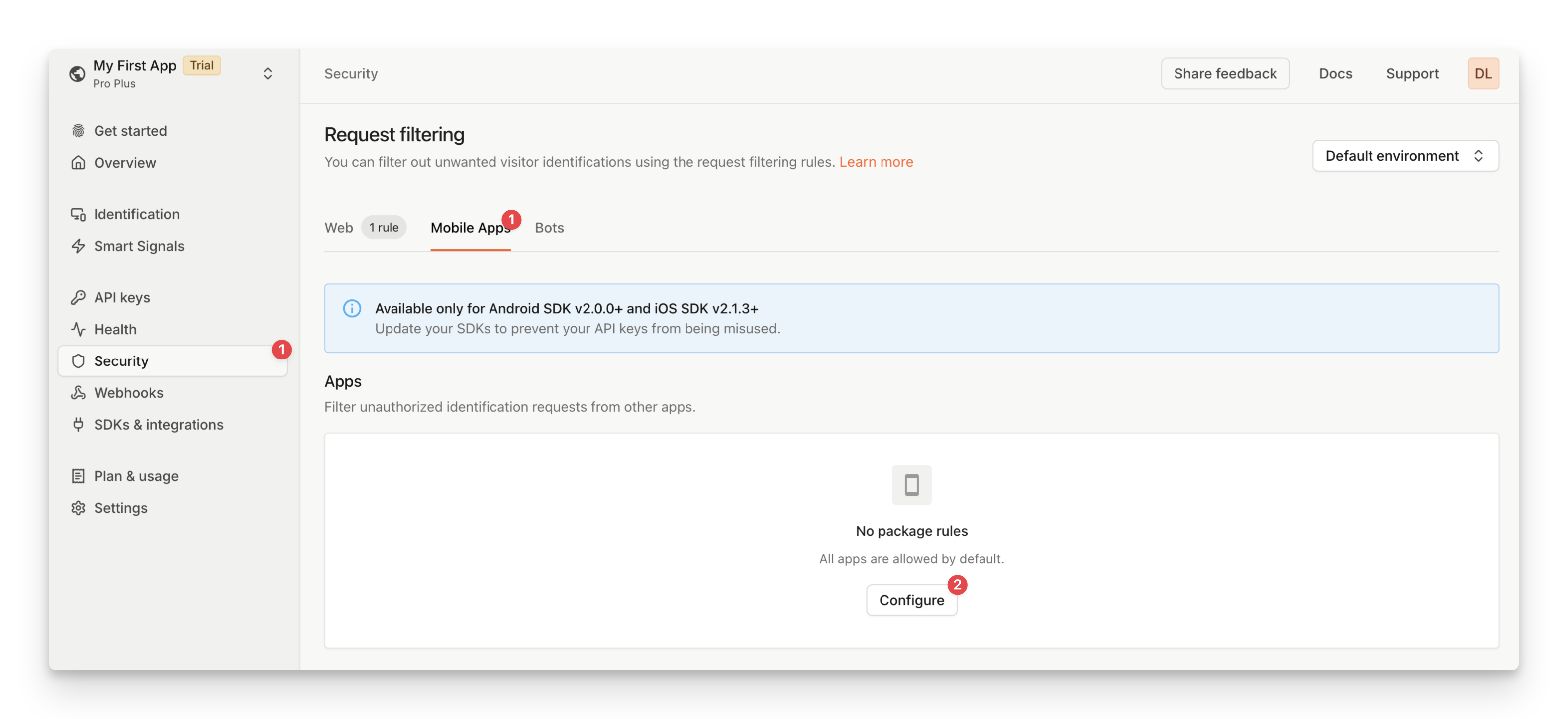 You can create mobile request filtering rules from the Fingerprint dashboard by specifying the package names (Android) or bundle IDs (iOS) of the blocked or allowed applications.- Navigate to the Dashboard > Security > Mobile Apps.