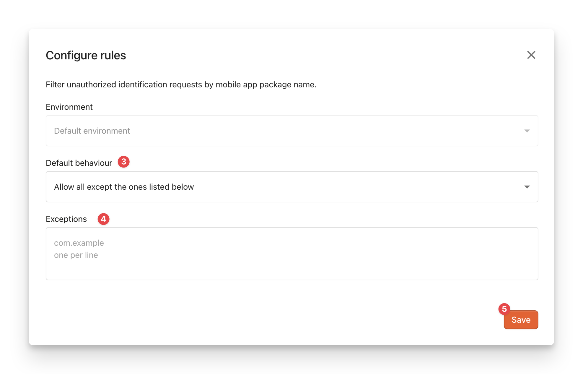 - Fill in the Exceptions with the package names (Android) or bundle IDs (iOS) of the mobile application you want to allow or block. Wild cards are accepted.